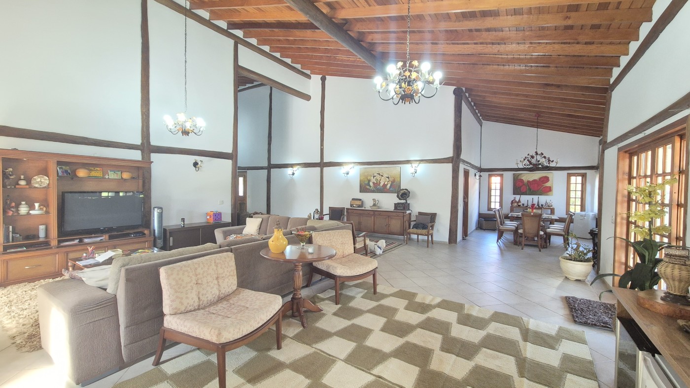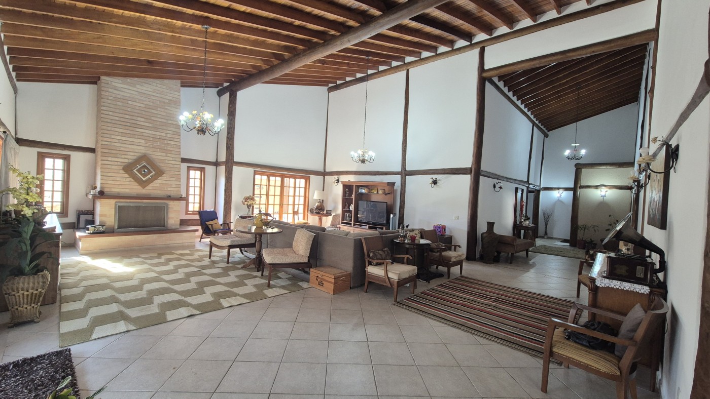 03 salas integradas com pé-direito alto (TV, estar e jantar), com lareira, proporcionando um ambiente acolhedor e elegante;